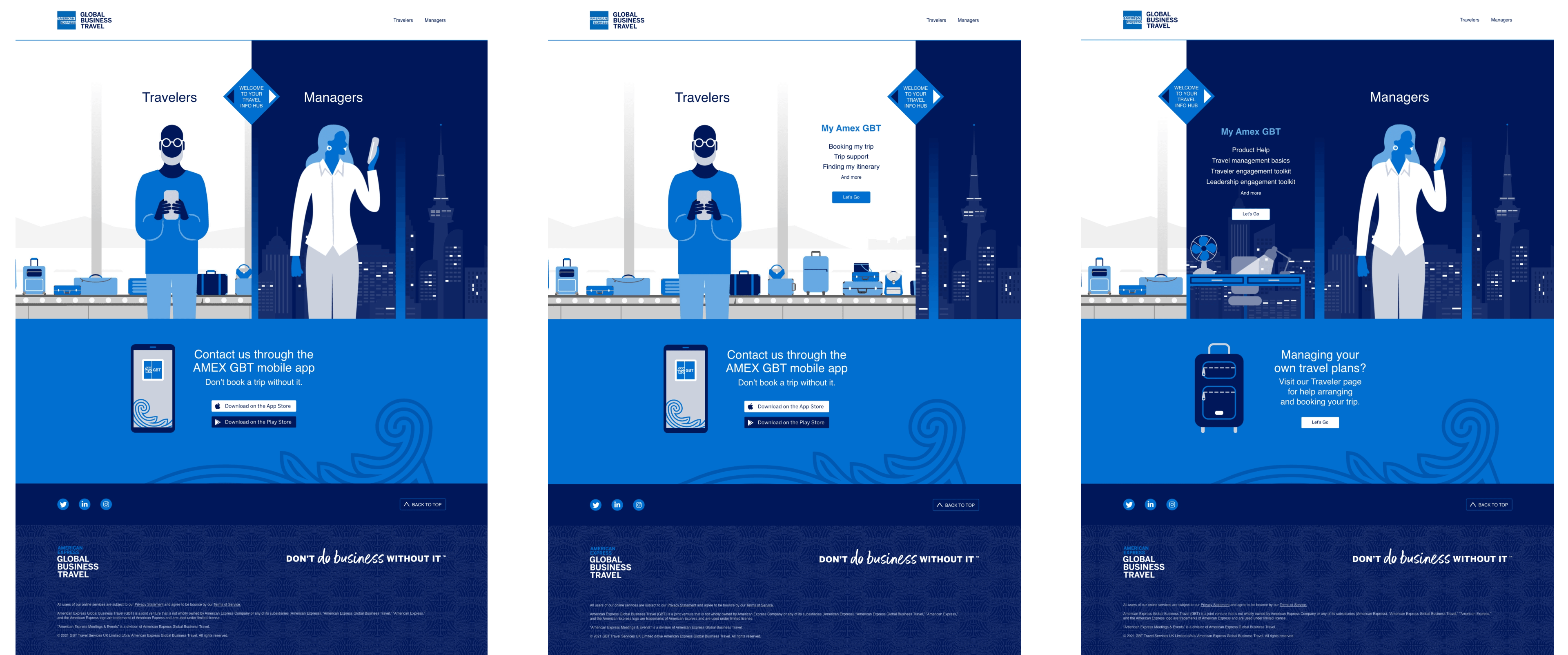 (Selected screens from the Amex GBT Travel Hub at time of launch.)